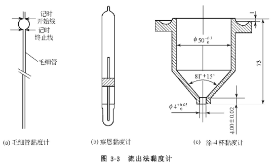 通过测定液体涂料在一定容积的容器内流出的时间来表示涂料的黏度。依据使用的仪器可分为毛细管法和流量杯法(见图3-3)。这是比较常用的方法。